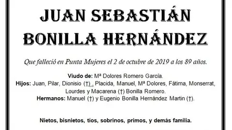 D.E.P. Juan Sebastián Bonilla Hernández Crónicas 3/10/19 Que falleció en Punta Mujeres el 2 de octubre de 2019 a los 89 años de edad