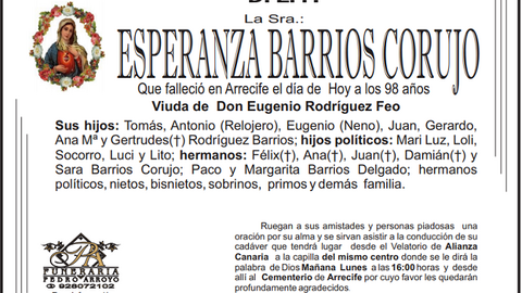 D.E.P. Esperanza Barrios Corujo Crónicas 13/10/19 Que falleció en Arrecife este domingo, 13 de octubre de 2019, a los 98 años de edad