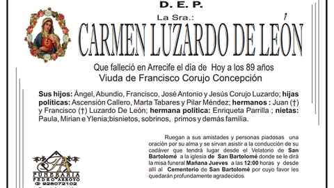 D.E.P. Carmen Luzardo de León Crónicas 23/10/19 Que falleció en Arrecife el día de hoy, 23 de Octubre de 2019, a los 89 años de edad