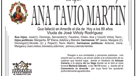 D.E.P. Ana Tavío Martín Crónicas 25/10/19 Que falleció en Arrecife el día de hoy, 25 de octubre de 2019, a los 89 años de edad