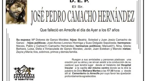 D.E.P. José Pedro Camacho Hernández 3/7/18 Que falleció en Arrecife este lunes, 2 de julio de 2018, a los 67 años de edad