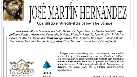 D.E.P. José Martín Hernández 15/8/18 Que falleció en Arrecife este miércoles, 15 de agosto de 2018, a los 68 años
