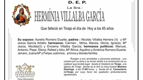 D.E.P. HERMÍNIA VILLALBA GARCÍA Crónicas 22/9/18 Que falleció en Tinajo el 22 de septiembre de 2018 a los 65 años de edad