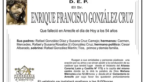 D.E.P. Enrique Francisco González Cruz Crónicas 2/10/18 Que falleció en Arrecife el día de hoy, 2 de octubre de 2018, a los 54 años de edad