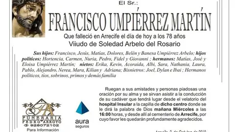 D.E.P. Francisco Umpiérrez Martín Crónicas 2/10/18 Que falleció en Arrecife el día de hoy, 2 de octubre de 2018, a los 78 años de edad
