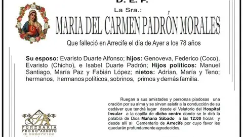 D.E.P. María del Carmen Padrón Morales Crónicas 5/10/18 Que falleció en Arrecife el día de ayer, 4 de octubre de 2018, a los 78 años de edad