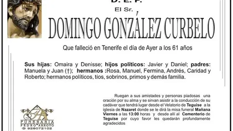 D.E.P. Domingo González Curbelo 11/10/18 Que falleció en Tenerife este miércoles, 10 de octubre de 2018, a los 61 años de edad