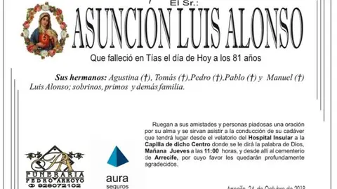 D.E.P. Asunción Luis Alonso 24/10/18 Que falleció en Tías este miércoles 24 de octubre de 2018, a los 81 años de edad