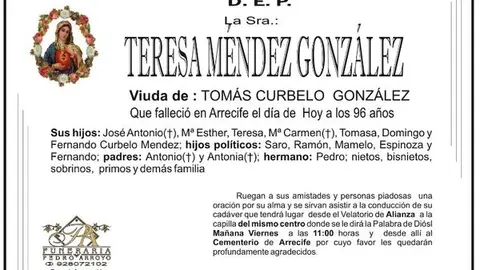 D.E.P. Teresa Méndez González 1/11/18 Viuda de Tomás Curbelo González. Falleció en Arrecife este jueves, 1 de noviembre de 2018, a los 96 años de edad