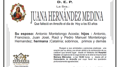 D.E.P. Juana Hernández Medina Crónicas 7/11/18 Que falleció en Arrecife en el día de ayer, 6 de noviembre, a los 83 años de edad
