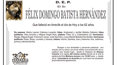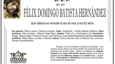 D.E.P. Félix Domingo Batista Hernández Crónicas 7/11/18 Que falleció en Arrecife en el día de hoy, 7 de noviembre de 2018, a los 62 años