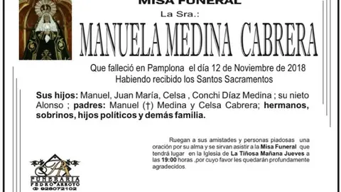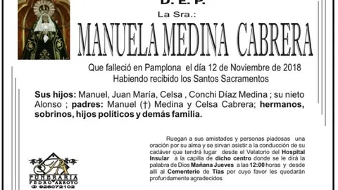 D.E.P. Manuela Medina Cabrera Crónicas 14/11/18 Que falleció en Pamplona, el 12 de noviembre de 2018, habiendo recibido los Santos Sacramentos