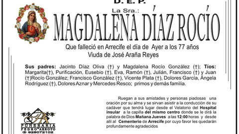 D.E.P. Magdalena Díaz Rocío Crónicas 26/12/18 Que falleció en Arrecife este pasado martes, 25 de Diciembre de 2018, a los 77 años de edad. Viuda de José Araña Reyes