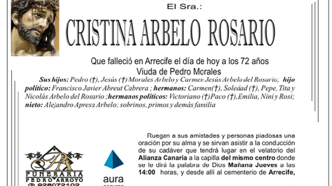 D.E.P. Cristina Arbelo Rosario Crónicas 3/1/19 Que falleció en Arrecife este miércoles, 2 de enero de 2019, a los 72 años de edad. Viuda de Pedro Morales