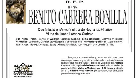D.E.P. Benito Cabrera Bonilla 21/1/19 Que falleció en Arrecife este lunes, 21 de enero de 2019. Viudo de Juana Lorenzo Curbelo