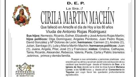D.E.P. Doña Cirila Martín Machín Crónicas 17/2/19 Que falleció en Arrecife este domingo, 17 de febrero de 2019, a los 80 años de edad
