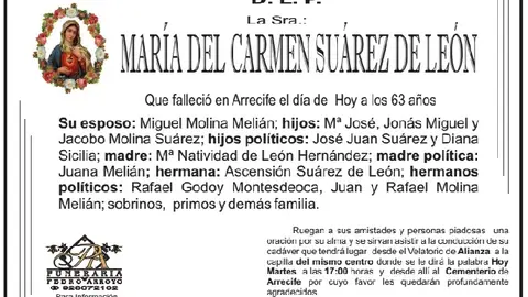 D.E.P. María del Carmen Suárez de León 9/3/17 Que falleció el 7 de marzo de 2017 en Arrecife a los 67 años
