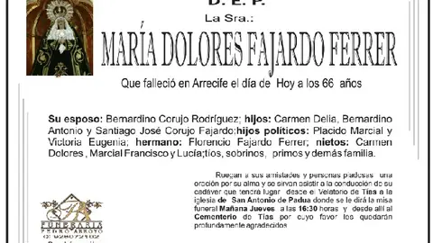 D.E.P. María Dolores Fajardo Ferrer 29/3/17 Que falleció en Arrecife el 29 de marzo de 2017 a los 66 años de edad