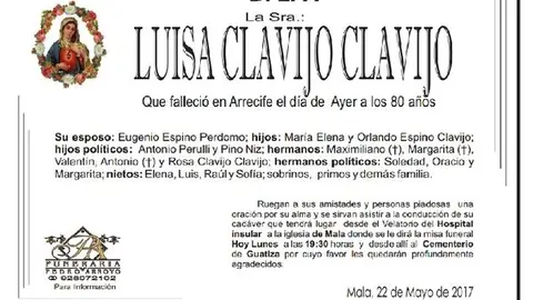 D.E.P. Luisa Clavijo Clavijo 22/5/17 Que falleció este 21 de mayo de 2017 en Arrecife, a los 80 años de edad