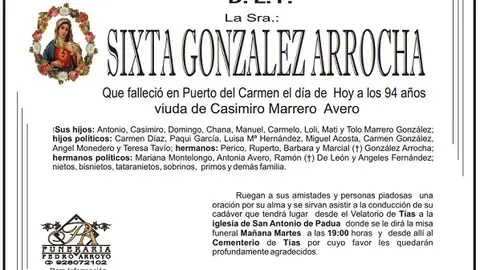 D.E.P. Sixta González Arrocha 5/6/17 Que falleció a los 94 años este 5 de junio de 2017, viuda de Casimiro Marrero Avero