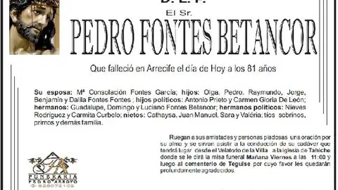 D.E.P. Pedro Fontes Betancort 6/7/17 Que falleció en Arrecife este jueves, 6 de julio de 2017, a los 81 años de edad