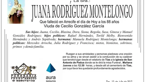 D.E.P. Juana Rodríguez Montelongo 12/7/17 Que falleció en Arrecife el 12 de julio de 2017. Viuda de Cecilio González García