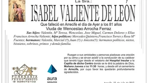 D.E.P. ISABEL VALIENTE DE LEÓN 19/7/17 Que falleció en Arrecife este martes, 18 de julio de 2017. Viuda de Wenceslao Arrocha Ferraz