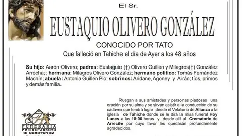 D.E.P. EUSTAQUIO OLIVERO GONZÁLEZ 14/8/17 Conocido por TATO, que falleció en Tachíche este domingo, 13 de agosto de 2017, a los 48 años de edad