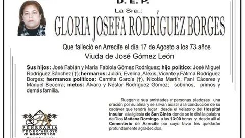 D.E.P. Gloria Josefa Rodríguez Borges 18/8/17 Que falleció en Arrecife el día 17 de agosto de 2017a los 73 años, viuda de José Gómez León