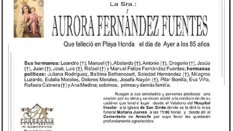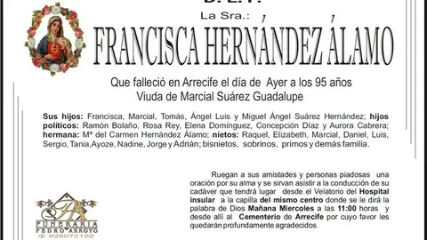 D.E.P. Francisca Hernández Álamo 10/10/17 Que falleció en Arrecife este lunes, 9 de octubre de 2017, a los 95 años de edad. Viuda de Marcial Suárez Guadalupe