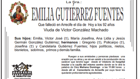 D.E.P. Emilia Gutiérrez Fuentes 26/8/17 Que falleció en Arrecife este sábado, 26 de agosto de 2017, a la edad de 92 años. Viuda de Víctor González Machado