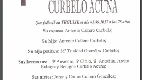 D.E.P. Nieves Curbelo Acuña 1/9/17 Que falleció en Teguise el 1 de septiembre de 2017 a los 75 años. Esposa de Antonio Callero Tejera