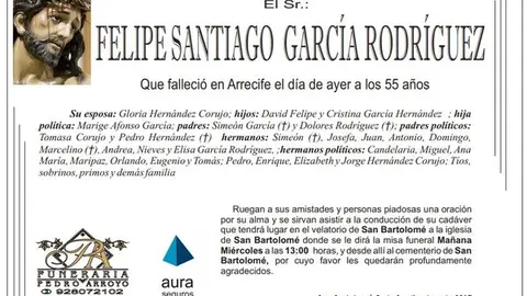 D.E.P. Felipe Santiago García Rodríguez 5/9/17 Que falleció en Arrecife este lunes, 4 de septiembre de 2017, a los 55 años de edad