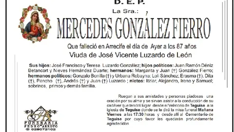 D.E.P. Mercedes González Fierro 21/9/17 Que falleció en Arrecife este miércoles, 20 de septiembre de 2017 a los 87 años de edad. Viuda de José Vicente Luzardo de León