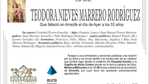 D.E.P. Teodora Nieves Marrero Rodríguez 17/10/17 Que falleció en Arrecife en el día de ayer, 16 de octubre de 2007, a los 53 años de edad