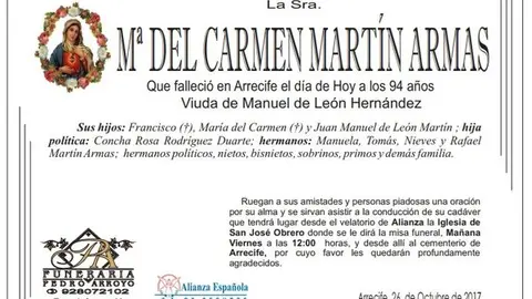 D.E.P. María del Carmen Martín Armas 26/10/17 Que falleció en Arrecife a los 94 años de edad este jueves, 26 de octubre de 2017. Viuda de Manuel de León Hernández