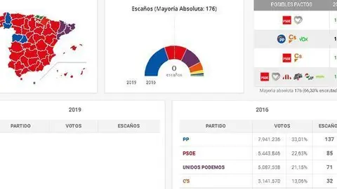 La eventual alianza entre el PSOE y Ciudadanos señalada por el líder morado, Pablo Iglesias, durante la campaña no alcanza los escaños necesarios para que Pedro Sánchez repita como presidente