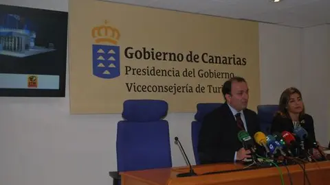 El consejero de Turismo, Ricardo Fernández de la Puente Armas, y la gerente de Promotur, María Méndez, presentan los detalles del pabellón de Canarias