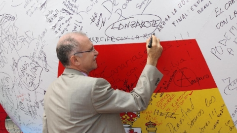 El alcalde de Arrecife, Cándido Reguera, y la concejal de Comercio, María del Amor Castañeyra, firman el balón de casi cuatro metros de alto instalado en el Parque José Ramírez Cerdá en apoyo a la selección española de fútbol