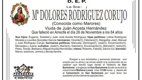Esquelas Que falleció en Arrecife a los 84 años D.E.P. María Dolores Rodríguez Corujo Crónicas 27/11/22