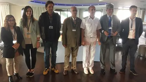 Tomás Fajardo, consejero de la Autoridad Portuaria en representación del Ayuntamiento de Arrecife, da la bienvenida al capitán del buque L´Austral y le entrega la metopa del Ayuntamiento