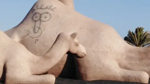 Algún simpático grafitero poco amigo de respetar los monumentos públicos ha pintado uno de los camellos que adornan la principal carretera que conduce a Yaiza